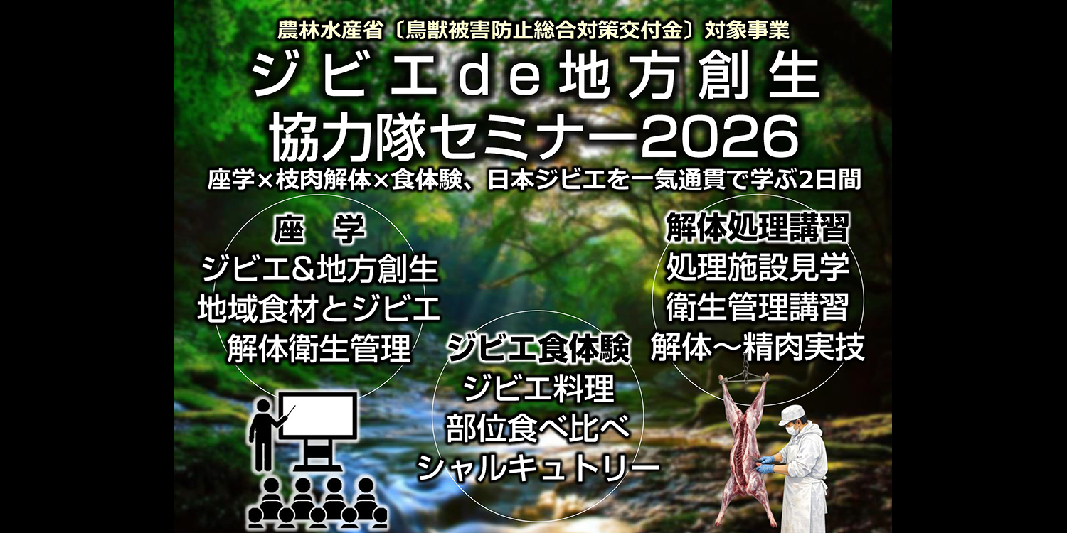 当協会は、捕獲されたシカやイノシシをおいしく安全な食肉として利用するために必要な技術や情報を広く周知し、鳥獣被害に悩む地域がジビエの利用により活性化することを目指しています。