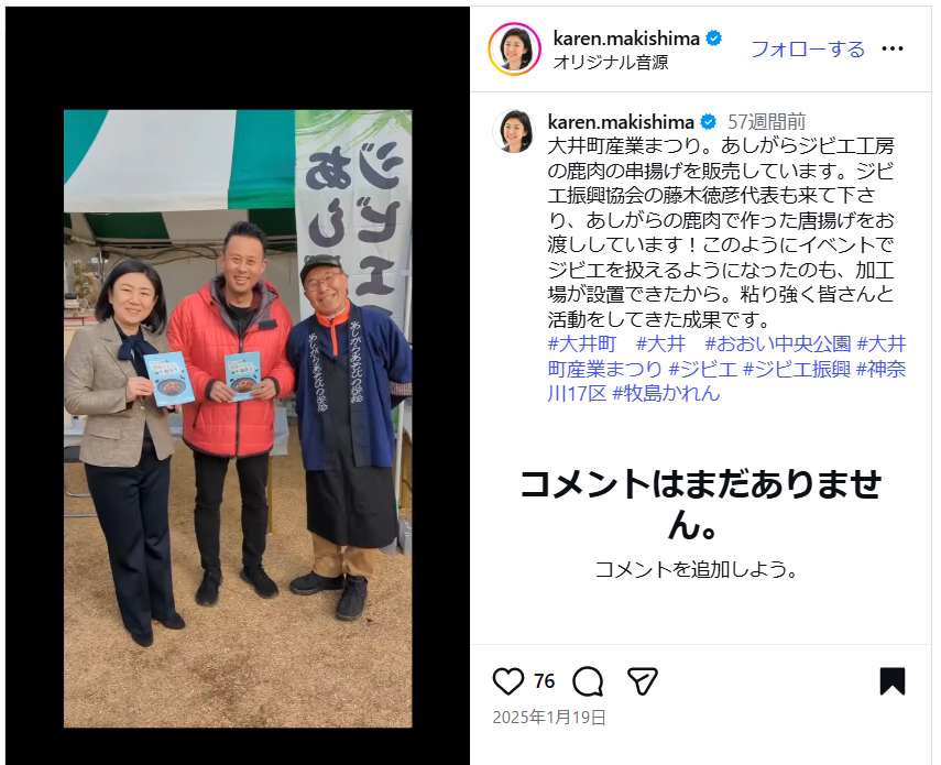 おおい中央公園で、特産品の販売、ステージショー餅まきなど、地域の魅力が集まるイベントとして開催されました。画像は牧島かれん衆議院議員のInstaより。